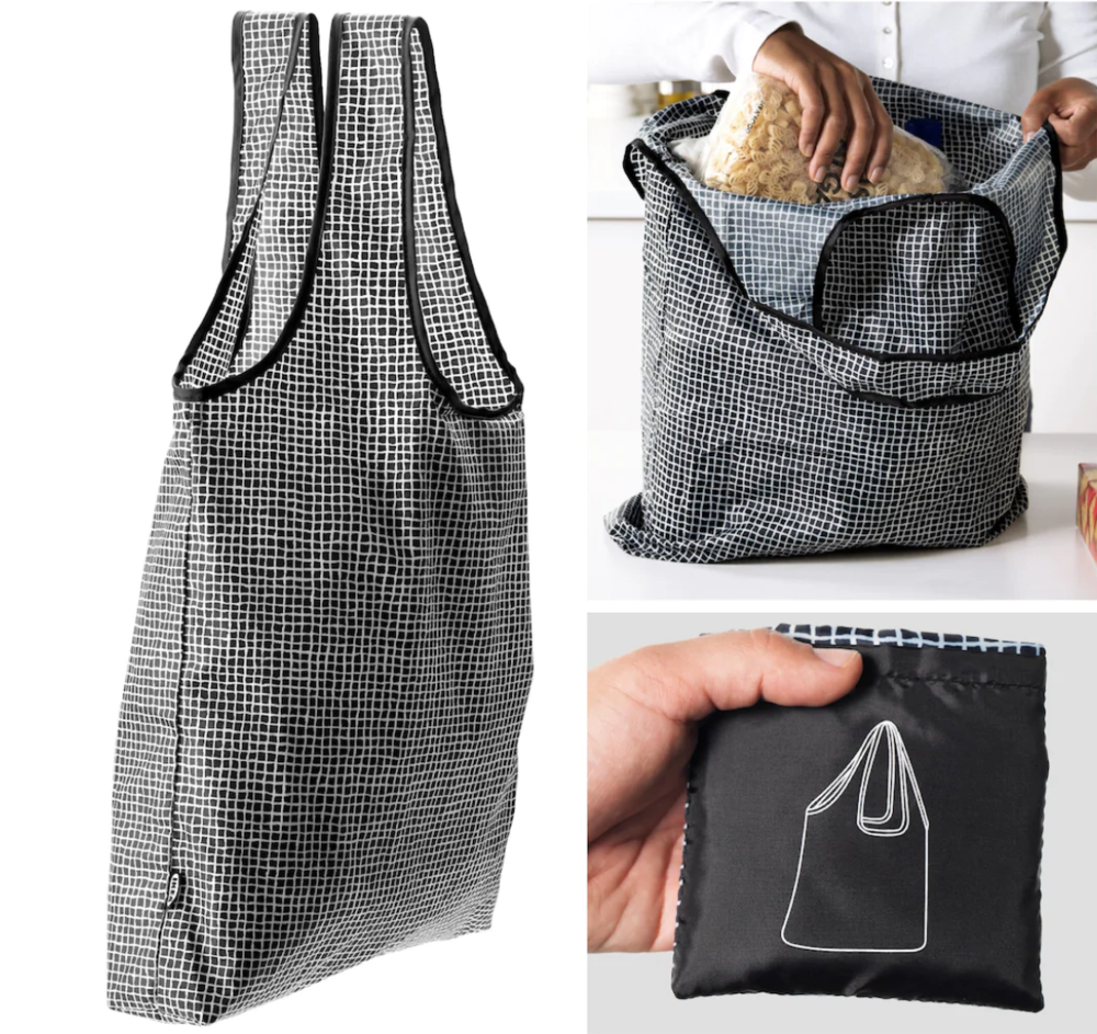 Bring your own reusable bags when grocery shopping! These bags are often made out of canvas or nylon and can be purchased in countless designs. The nylon ones are often stain and spill-resistant as well, so no need to worry about using them for produce! This bag is available here for under $5!